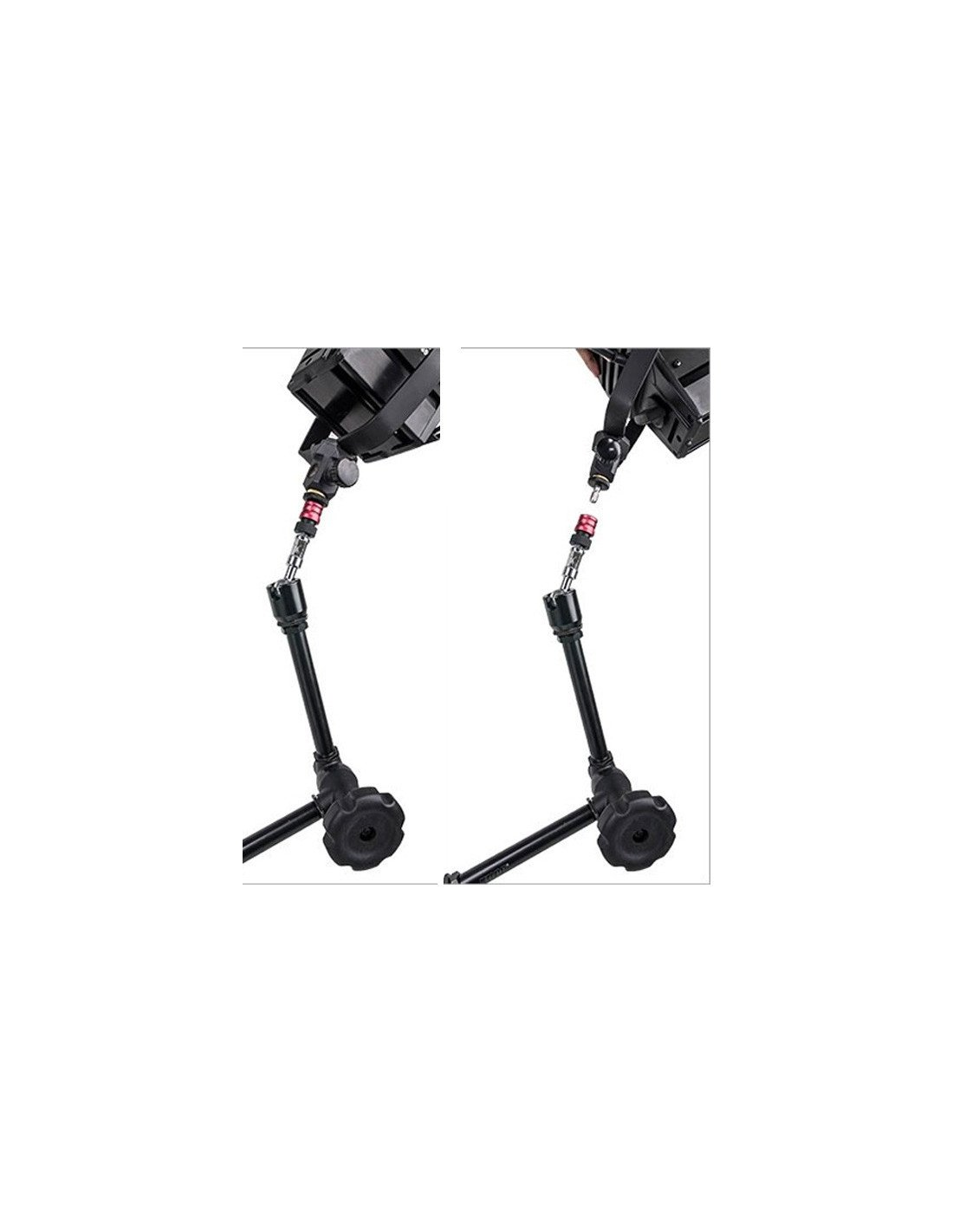 El montaje superior se sujeta con el anillo de bloqueo a cualquier luz, micrófono, monitor u otro engranaje con entradas de 5/8 . El extremo hexagonal del montaje superior encaja en la liberación rápida de acción de resorte y se monta y desmonta rápida y fácilmente.