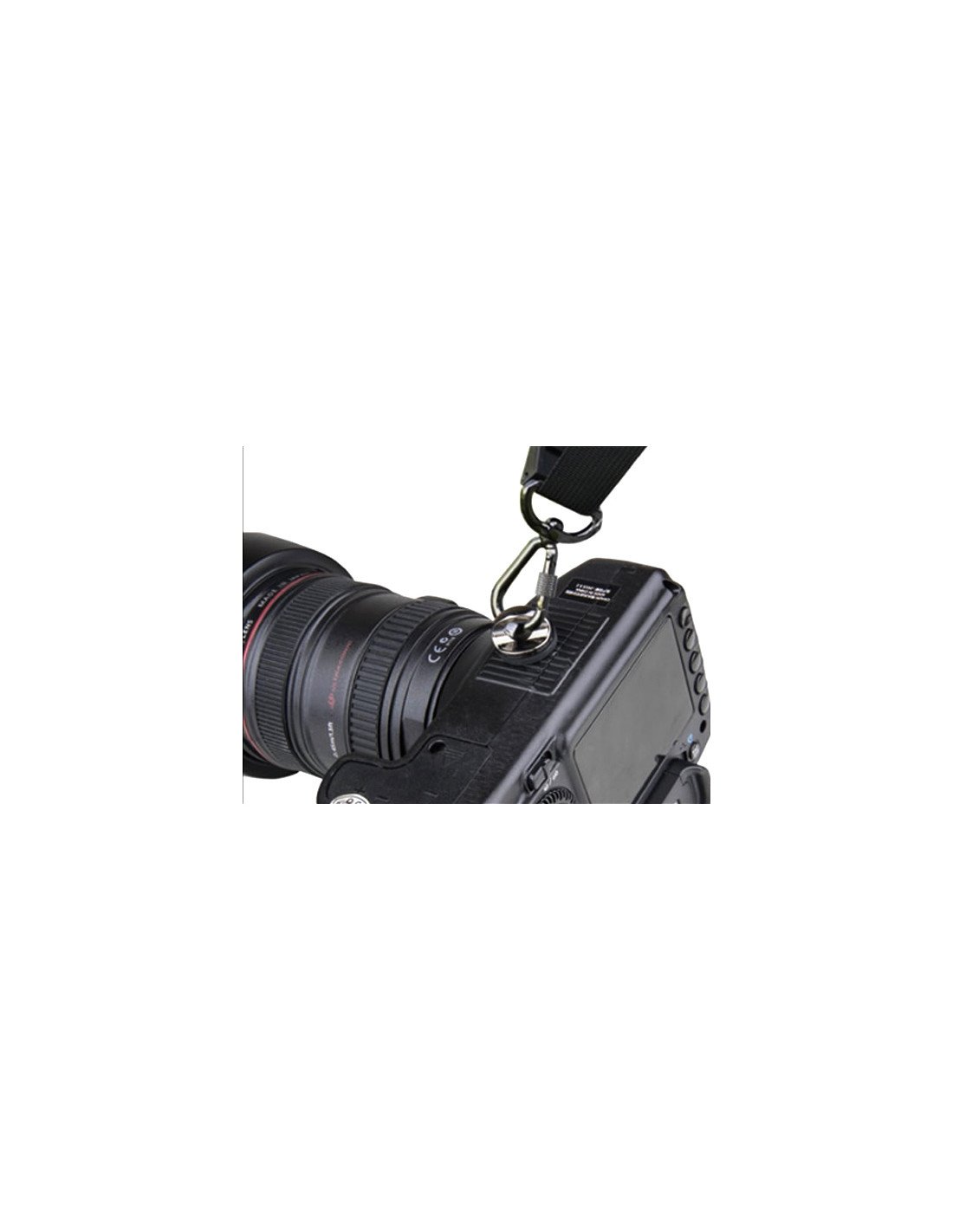 El tornillo de 1/4" también tiene una almohadilla de goma negra que evita que se raye el equipo de la cámara. El anillo en D le permite Fije la correa de la cámara para el hombro con el gancho de resorte.