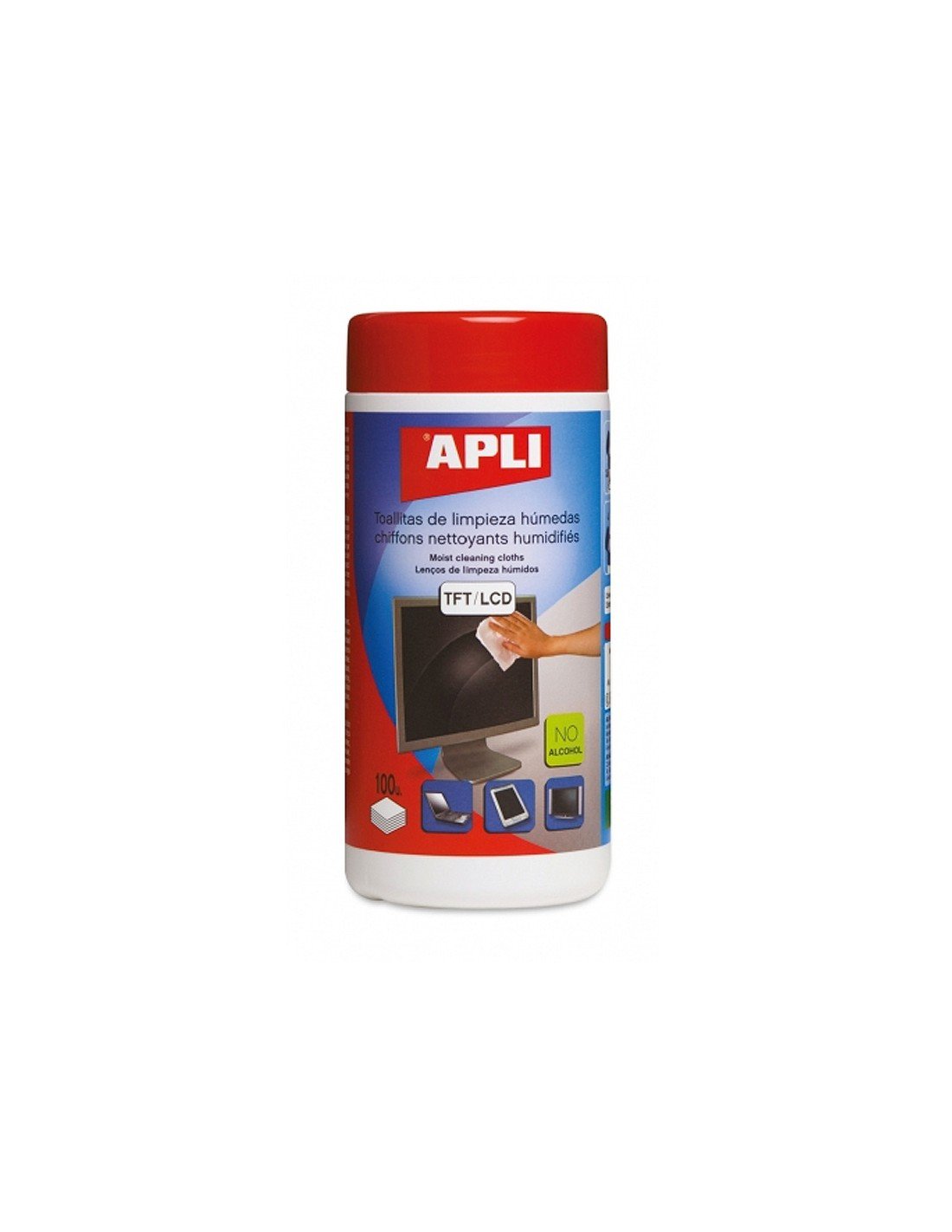 Bote que contiene 100 toallitas de limpieza APLI diseñadas específicamente para pantallas TFT/LCD. Estas toallitas húmedas están formuladas para limpiar dispositivos electrónicos y equipos informáticos, con propiedades antiestáticas que ayudan a prevenir la acumulación de polvo.